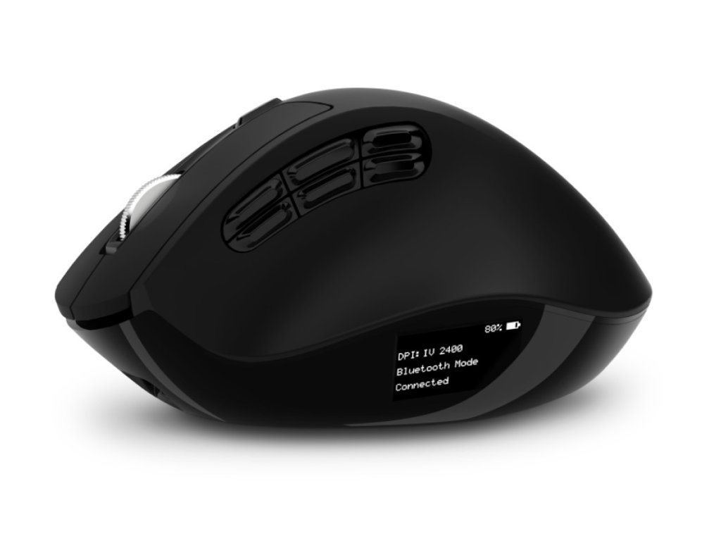 Na bočnom displeji vidíte stav batérie, zvolenej DPI aj práve aktívny režim – Bluetooth alebo 2,4 GHz. Navyše tu môžete nastaviť funkcie šiestich bočných tlačidiel, ktoré vám uľahčia každodennú prácu.