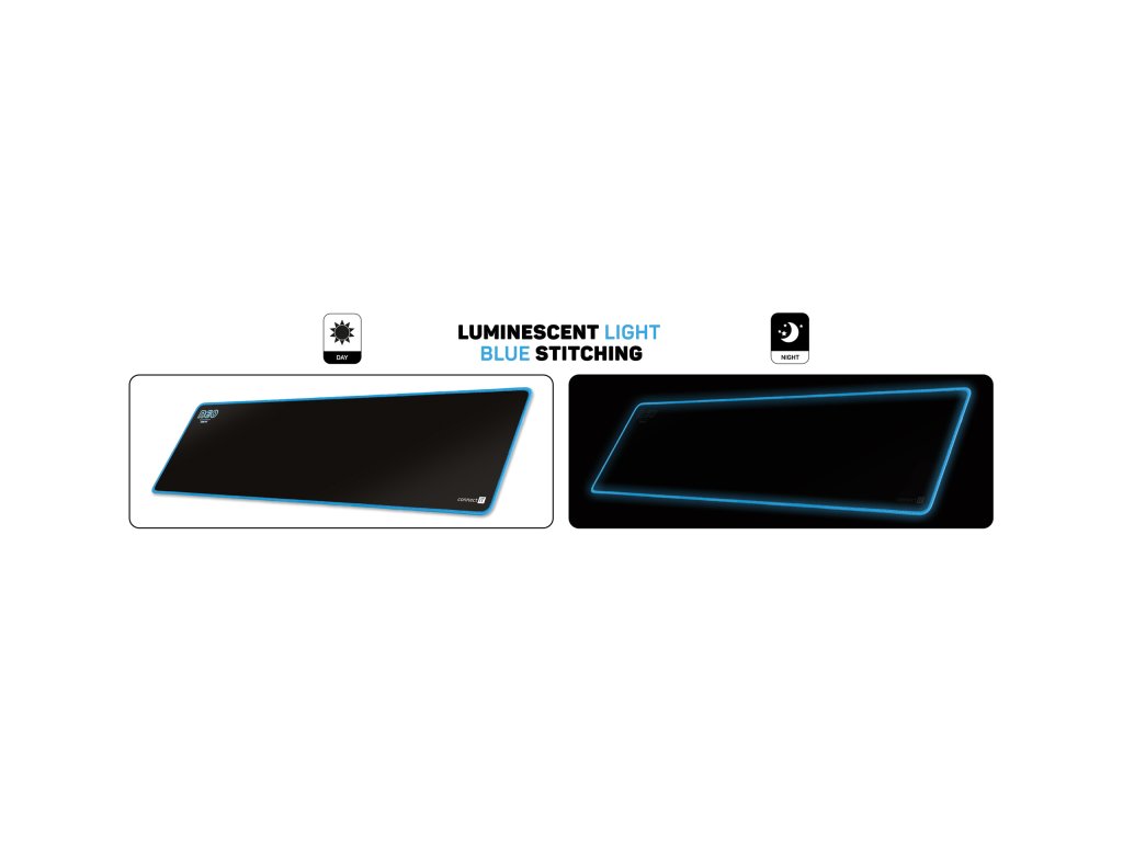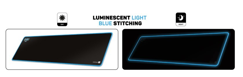 Podložka je po obvode obšitá špeciálnou luminiscenčnou niťou, ktorá v tme jemne svieti a dodáva hernému setupu výrazný vizuálny efekt bez nutnosti napájania. Obšité okraje zároveň chránia podložku proti štiepeniu a predlžujú jej životnosť.