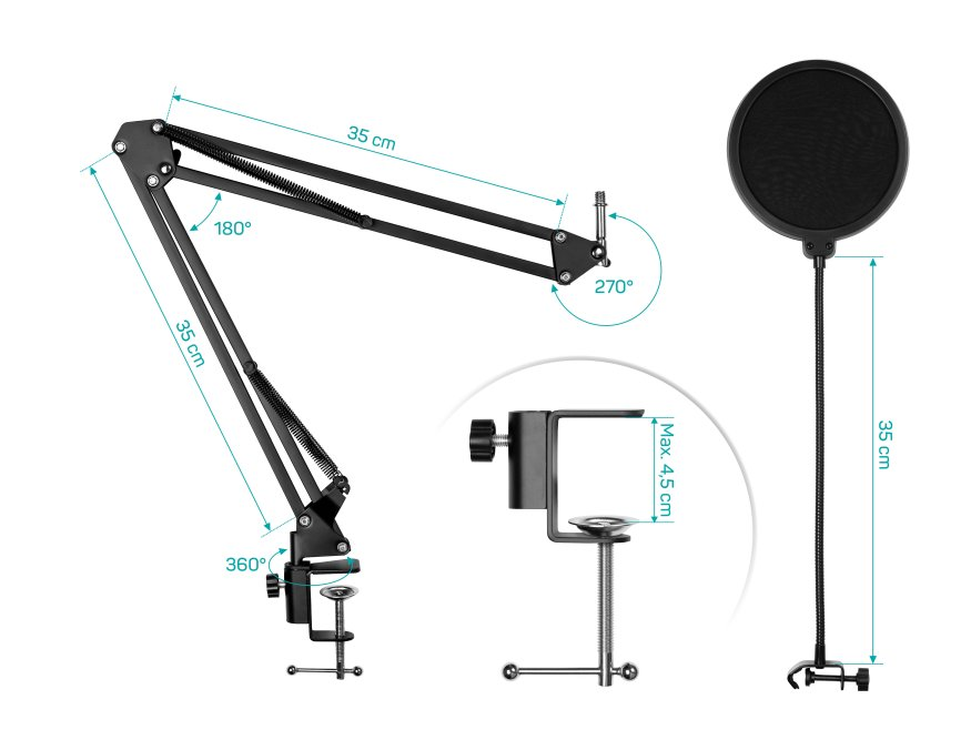 Mikrofón je uchytený na teleskopickom kovovom ramene s paralelogramovým mechanizmom a dvojicou pružín, ktoré umožňujú plynulé nastavenie výšky aj uhla. Rameno je možné pevne zafixovať pomocou motýlikových skrutiek a je určené pre montáž na dosku stola s hrúbkou až 4,5 cm. Bezrezonančné uchytenie minimalizuje prenos vibrácií zo stola.