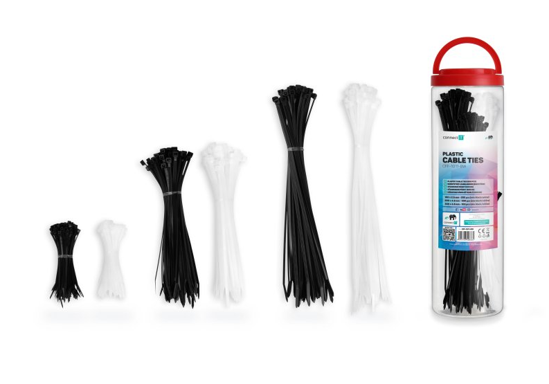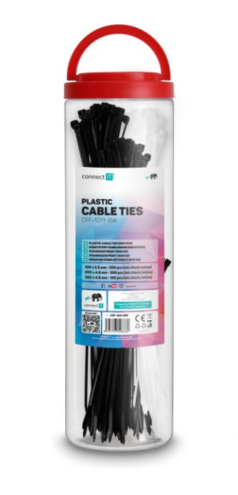 Connect IT ZipTie2 (CFF-1011-BW) je praktická sada 600 sťahovacích pások, ktorá vám pomôže rýchlo a pevne zviazať káble, upevniť vodiče alebo spojiť rôzne predmety. Vďaka kombinácii čiernej a bielej farby a niekoľkých dĺžok nájdete vždy správny variant na konkrétne použitie – od drobnej kabeláže až po pevnejšie zväzky.