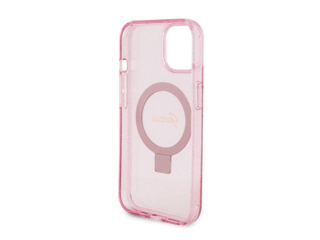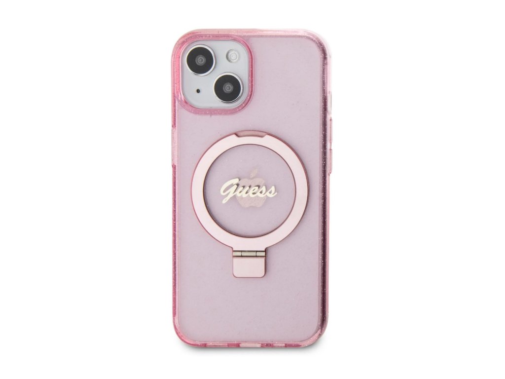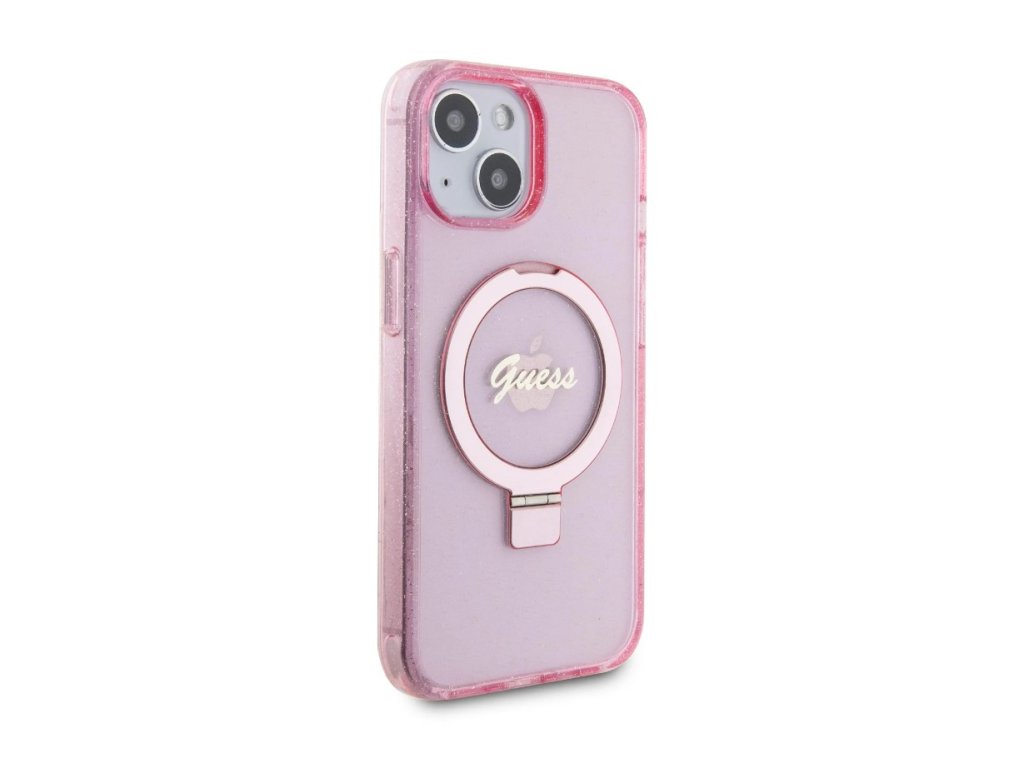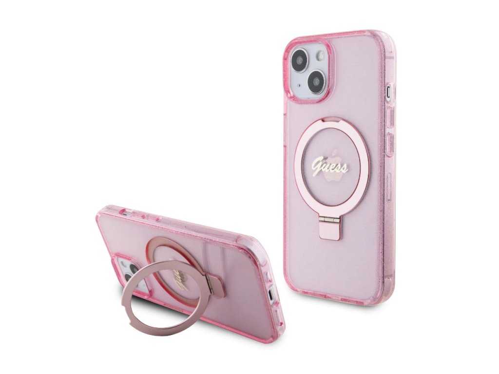 Guess IML Ring Stand Glitter MagSafe Zadný Kryt pre iPhone 15, ružová