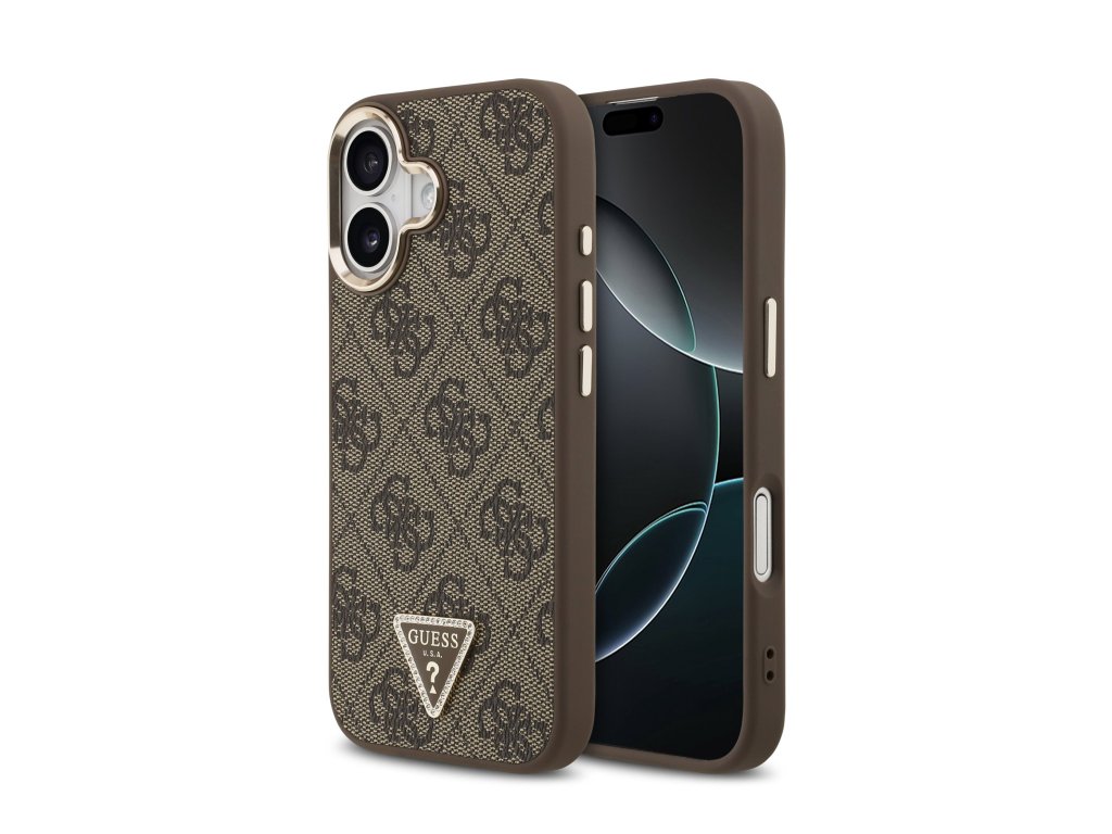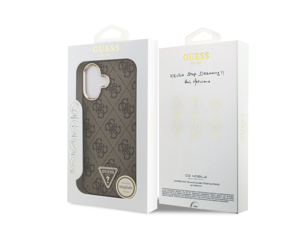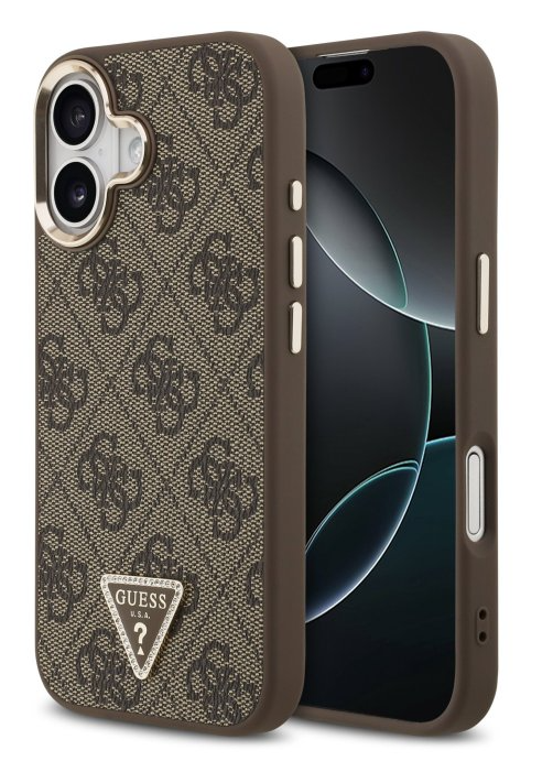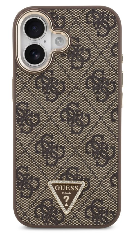 Guess PU Leather 4G Strass Triangle Logo Gold Frame MagSafe Zadný Kryt pre iPhone 17 – hnedá