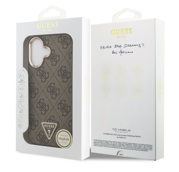 Guess PU Leather 4G Strass Triangle Logo Gold Frame MagSafe zadný kryt je výrazný módny doplnok, ktorý v sebe spája luxusný dizajn, ikonické prvky značky Guess a moderná funkčnosť. Tento kryt je ideálnou voľbou pre každého, kto chce svoj iPhone chrániť a zároveň mu dodať prémiový, neprehliadnuteľný vzhľad.