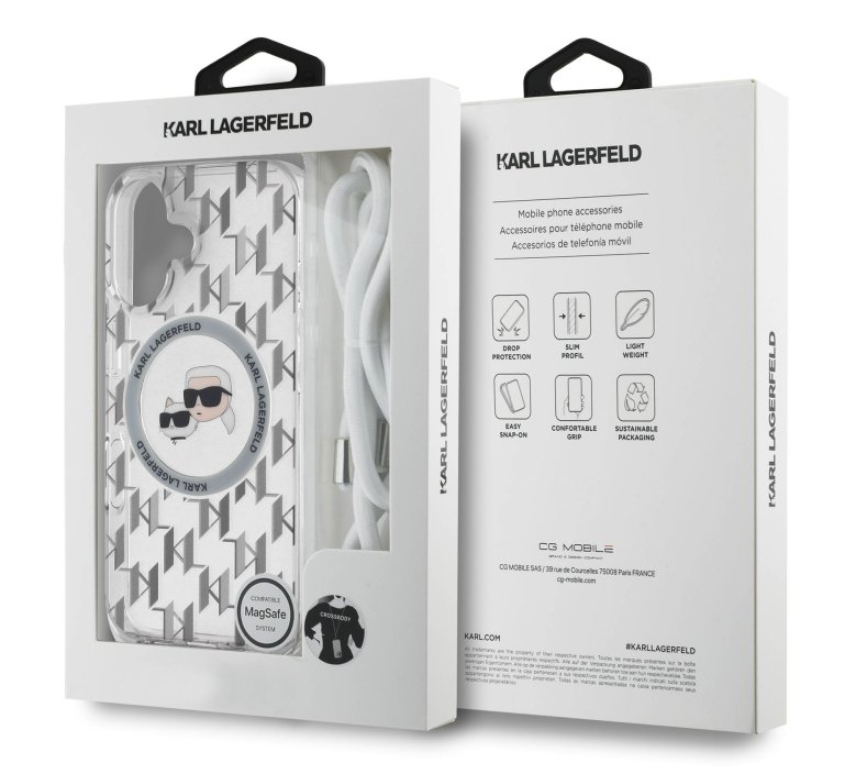 Karl Lagerfeld IML Monogram Crossbody K&CH Heads MagSafe je prémiový zadný kryt navrhnutý pre tých, ktorí chcú spojiť ochranu telefónu, moderné funkcie a výrazný módny štýl. Elegantný motív Karla Lagerfelda a jeho mačky Choupette z neho robí neprehliadnuteľný doplnok pre každý outfit.