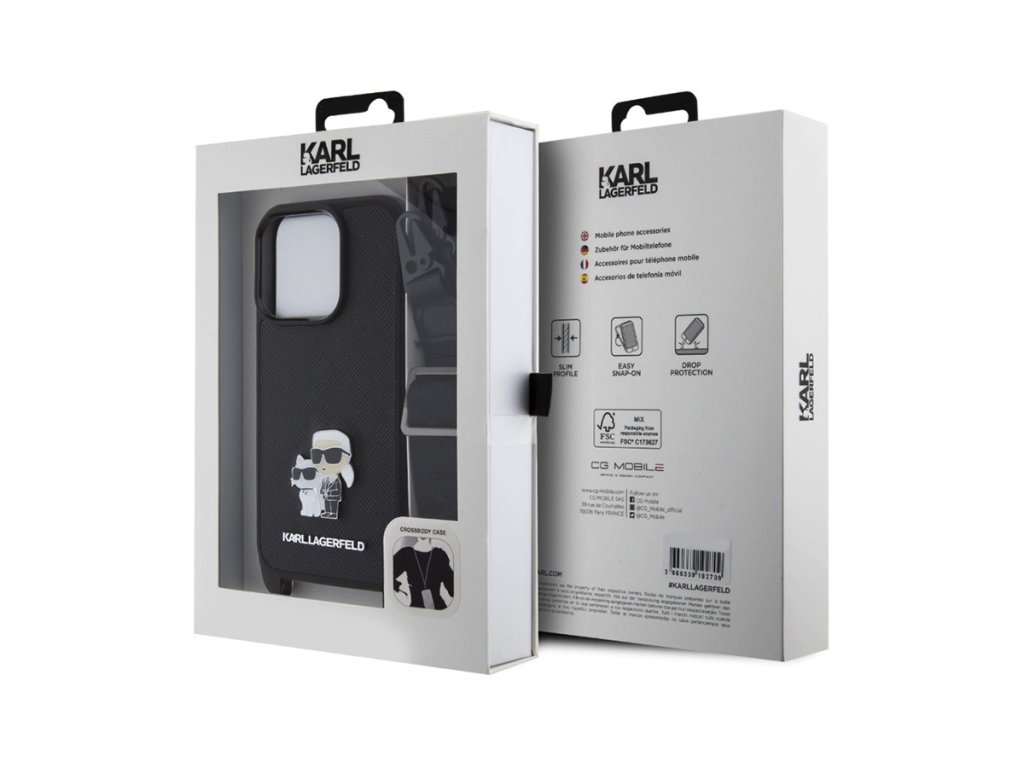 Zadný kryt Karl Lagerfeld Saffiano Crossbody Metal Karl and Choupette je ideálny pre tých, ktorí chcú svojmu telefónu dodať ikonický vzhľad a zároveň využiť pohodlie hands-free nosenia.