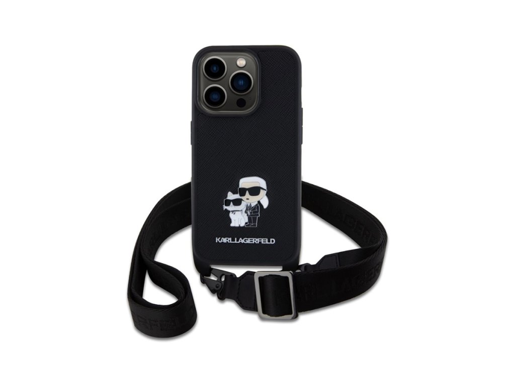 Karl Lagerfeld Saffiano Crossbody Popruh Metal Karl and Choupette Zadný Kryt pre iPhone 15 Pro Čierna