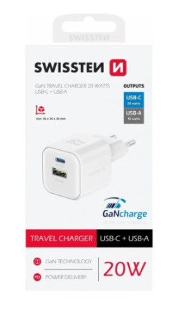 Nabíjačka do siete Swissten GaN 1× USB-C 20W PD + 1× USB-A 18W QC, biela(22071100)