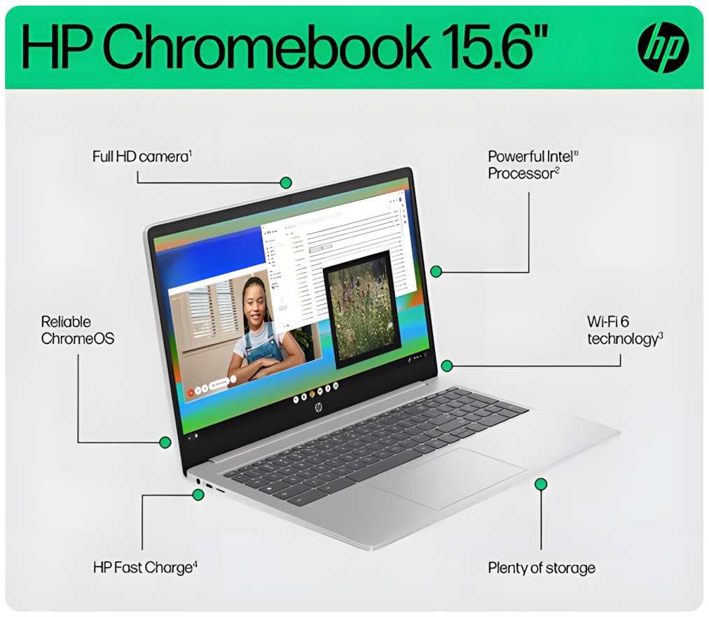 Veľká obrazovka, jednoduchosť ChromeOS a tichý chod na každý deň. HP Chromebook 15a-nb je navrhnutý tak, aby vám spríjemnil prácu, komunikáciu aj zábavu – bez zbytočných starostí. Antireflexný 15,6" displej s tenkými rámčekmi ponúkne viac priestoru, plnohodnotná klávesnica s numerikou zrýchli písanie aj prácu s číslami a ChromeOS sa postará o rýchle, bezpečné a prehľadné prostredie.