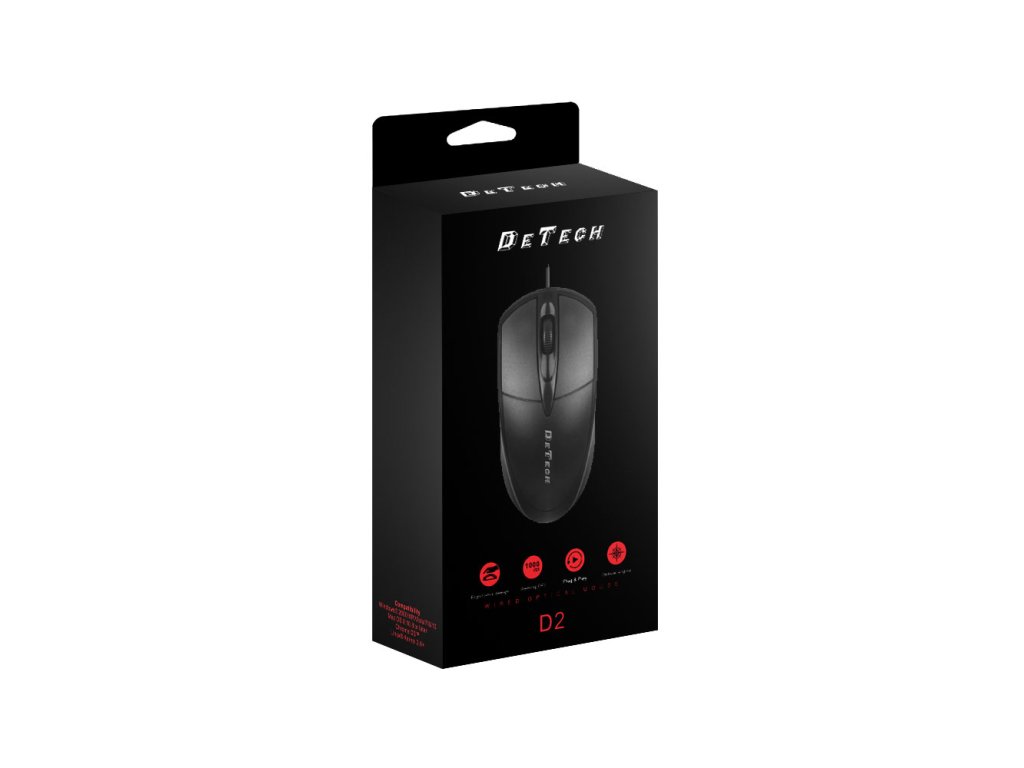Optická myš DeTech D2 je optická myš od firmy DeTech s jednoduchým designom, v čiernej farbe. Má tri postranné tlačidlá a rozhranie USB. Rozlíšenie je 1000DPI a senzor je optický.