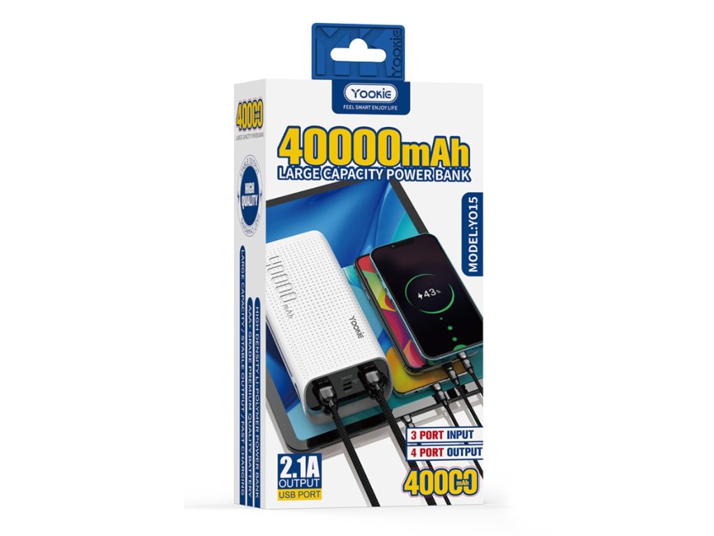 Prenosná batéria Yookie YO15 40000mAh power bank je externá batéria pre smartfóny, tablety a ďalšie zariadenia s USB portom. Má kapacitu 40000 mAh, čo znamená, že dokáže niekoľkokrát plne dobiť väčšinu mobilných zariadení. Má 4 USB výstupy, z ktorých každý podporuje rýchle nabíjanie až 2,1 A. Má tiež 3 vstupy na nabíjanie power banky: micro USB, USB-C a iOS. Power banka má LED indikátor stavu batérie a je vyrobená z PC+ABS materiálu. Je dodávaná s USB káblom a pútkom na uchytenie.
