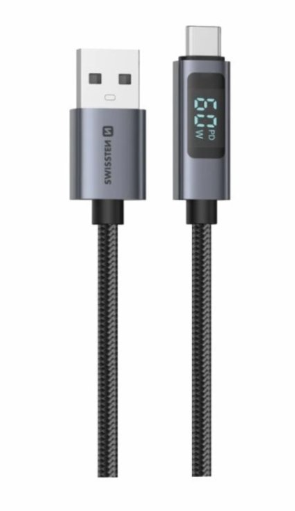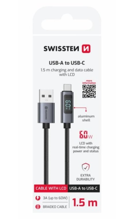 Swissten dátový kábel s LCD displejom, USB-A na USB-C – 1,5 m