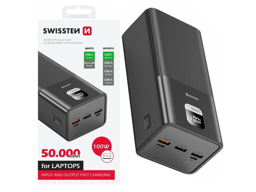 Elegantná powerbanka SWISSTEN s kapacitou 50.000mAh (185Wh) disponuje vysokým výstupným výkonom 100W, rýchlym dobíjaním a pre zvýšenie bezpečnosti je vyrobená z nehorľavého materiálu.