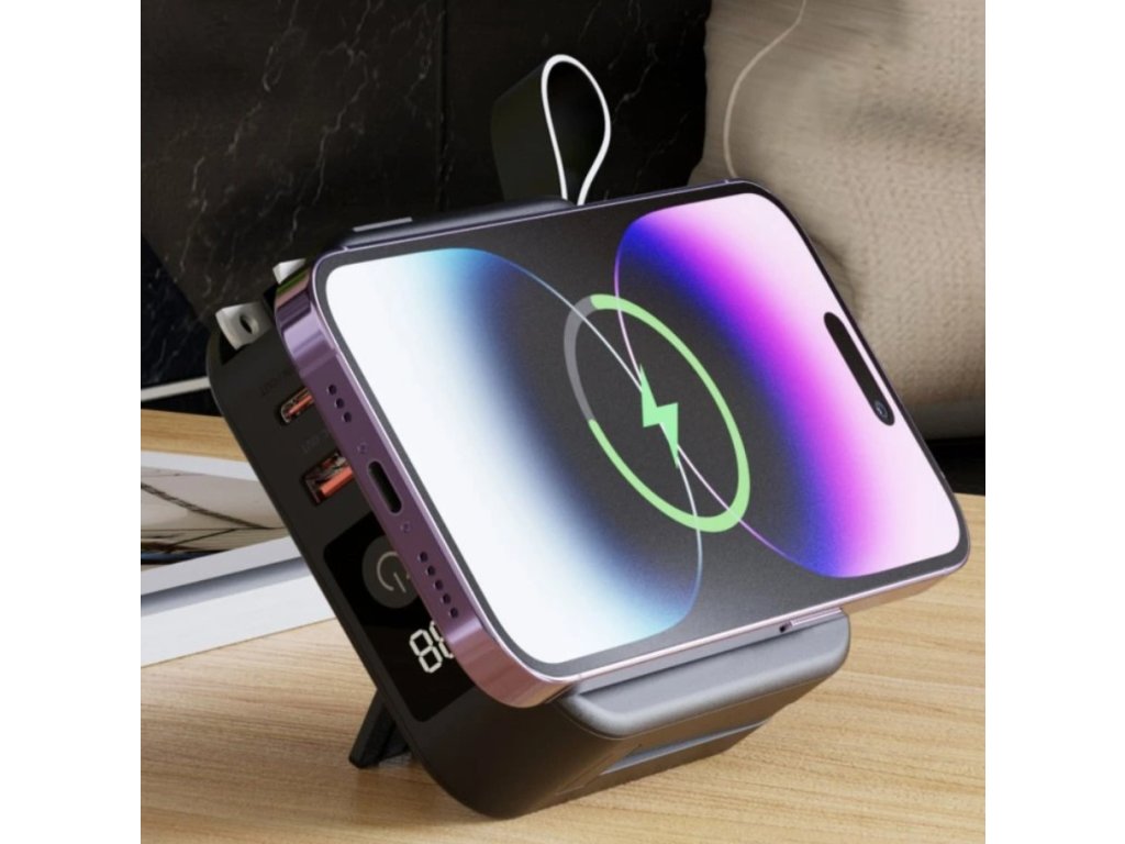 Powerbanka ponúka USB-C PD výstup s výkonom až 20 W,USB-A QC 18 W plusvstavaný USB-C kábel s dĺžkou 12 cm, Takže nie je nutné nosiť ďalší kábel. Pre bezdrôtové nabíjanie je k dispozícii MagSafe podložka až 15 W, samostatná plocha pre Apple Watch (2,5 W) aTWS slúchadlá (5 W).