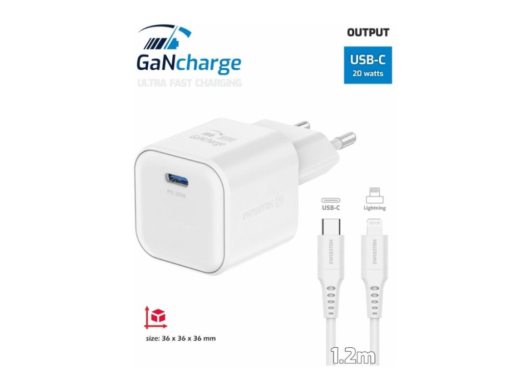 SWISSTEN sieťový adaptér GaN, USB-C, PD, 20W, biela + kábel USB-C - Lightning, 1.2m, biela