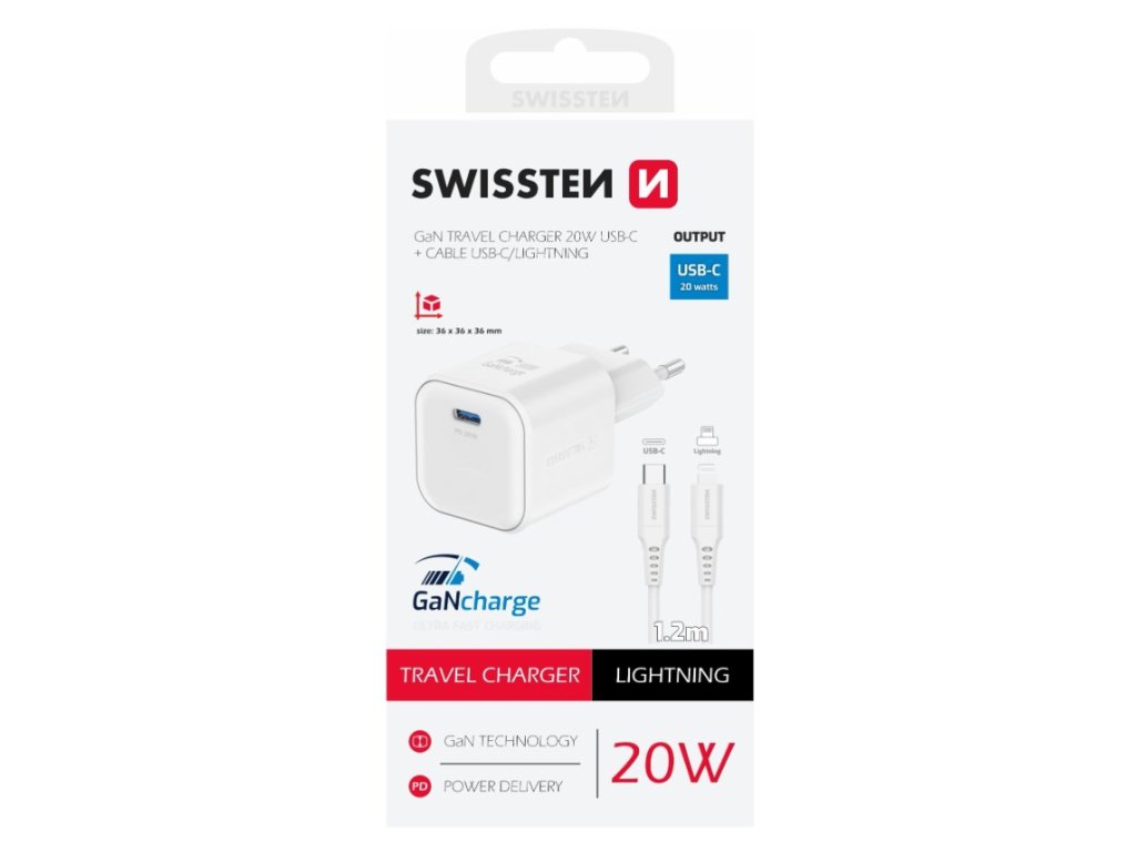 Swissten sieťový adaptér gan 1x usb-c 20w power delivery biely + dátový kábel usb-c/lightning 1,2 m - biely